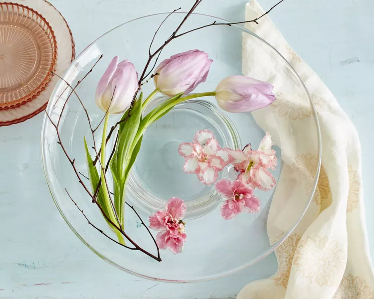 Cut dogwood limbs and Queen Anne’s lace from your yard and mix them with a bundle of cut tulips for an arrangement that imitates your blooming surroundings.