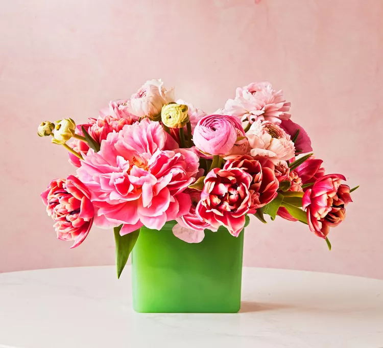 Use a variety of flowers to create a stunning monochromatic look. You can even pair the blooms with a complimentary colored vase. Here, chicken wire creates a base within the vessel to hold the pink double tulips, ranunculus (blooms and buds), and peonies in place.