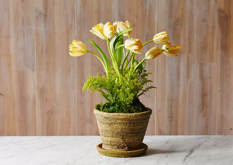 Buy a potted tulip from the store and dress it up with moss in a table-top friendly container. Be sure to keep it in full light near a window to ensure it grows when it’s not acting as a live centerpiece.