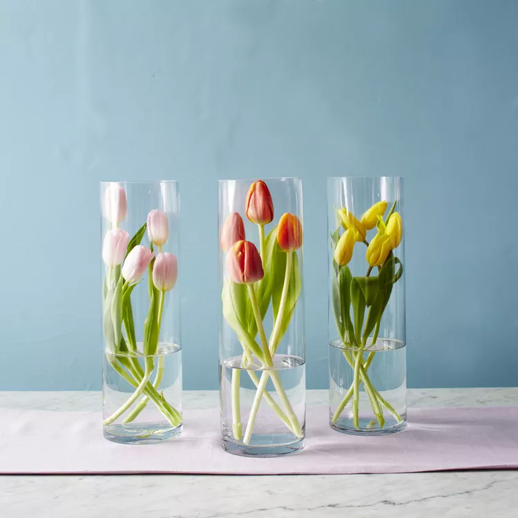 If you’re worried about your tulips drooping as they age in an arrangement, opt for tall vases, like the hurricanes, that will support their delicate stems.
