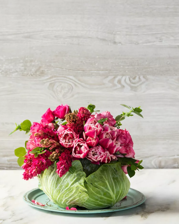 This arrangement is much simpler than it looks and is sure to impress guests. Start by trimming the bottom of one head of cabbage to create a flat base, then cut a hole the size of your vase (we suggest a mason jar) on top and remove the inside. Place the jar in the carved out space and fill with blooms!