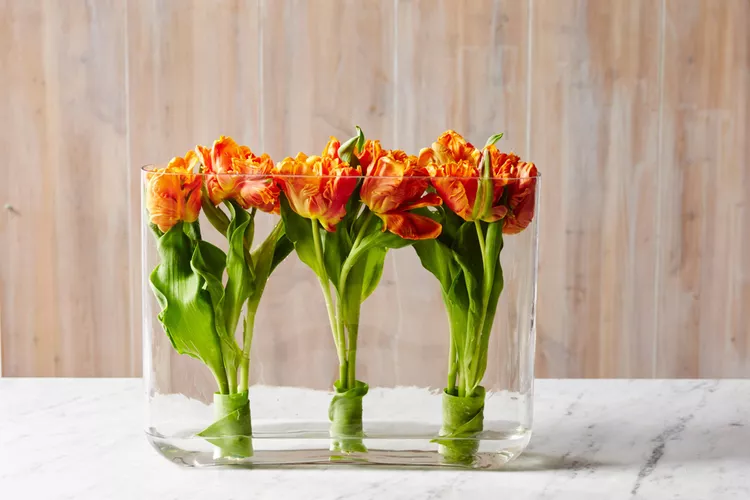 To achieve this look, cut all the tulip stems the same height and place them all in a wide-rimmed vase at the same time. Spin the stems just a bit so they create a circular effect, as shown in the image. If any of the leaves are hanging over the side of the vase, twirl them around a pencil to create a corkscrew.