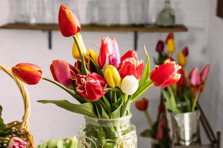 Tulips can be finicky because of their slender and delicate stems, so florist wire can be your friend or you can embrace their whimsy, letting them fall as they wish. After you’ve created your arrangement, be sure to rotate it so that the blooms receive equal sun exposure, as tulips grow toward light. Here are 20 tulip  arrangement ideas that highlight the spring bloom on its own and paired with other flowers.