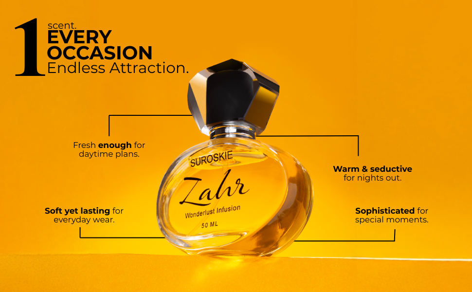 - Unisex & versatile: Suroskie markets Zahr as a unisex fragrance, suitable for men and women, and appropriate for many occasions — daily wear, office, date nights, parties. Price History+2belleblush.in+2