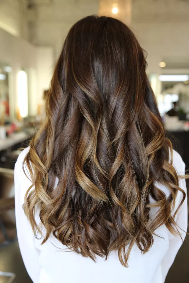 Deep brown hair gets a special treatment when two tones of ribbons are chosen. Your locks will see both texture and movement as a result of this choice in rich ribbon highlights.