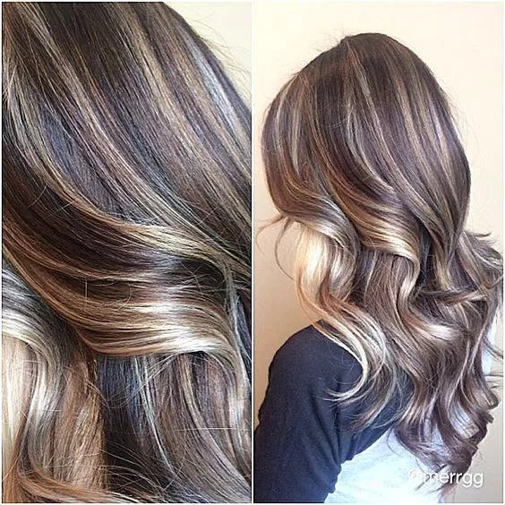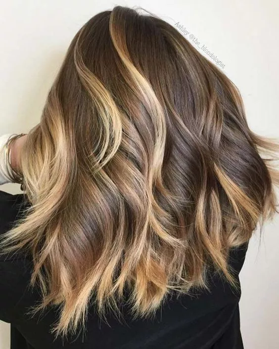 A dark base with cascading ribbons in lighter shades of brunette and bronde make for a creamy color that is warm with touches of cool. This look holds its magic in the dimensions that are created with the ribbon highlights.